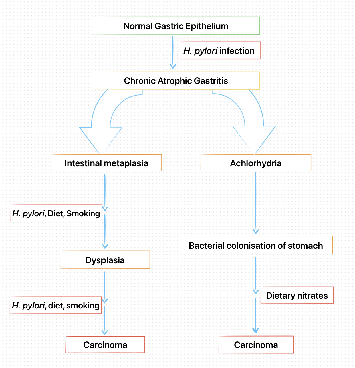 - Consumption of nitrites and nitrates : Carcinogenic N-nitroso compounds are formed from nitrates by the action of nitrite reducing bacteria which colonise the achlorhydric stomach.