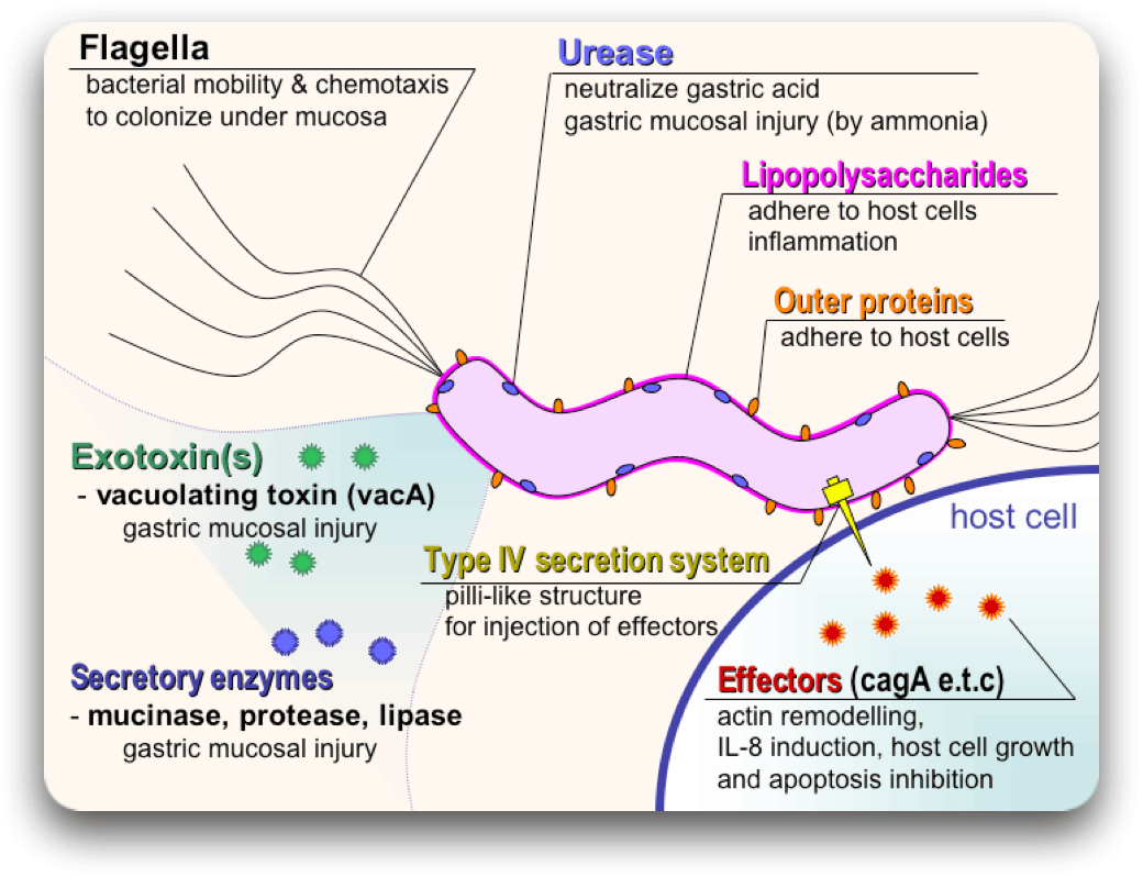 Different strains of H. pylori produce different virulence factors that in conjunction with additional bacterial constituents helps in gastric residence, induce mucosal injury and avoid host defense.
