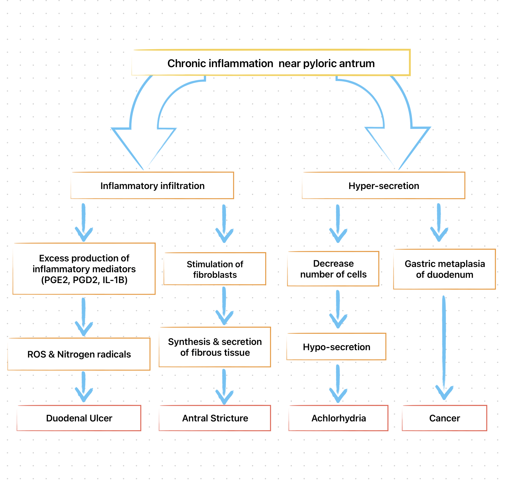 The type and distribution of gastritis correlate with the ultimate gastric and duodenal pathology observed.