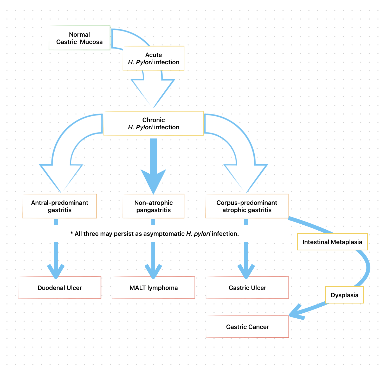 - The particular end result of H. pylori infection (gastritis, PUD, gastric MALT lymphoma, gastric cancer) is determined by a complex interplay between bacterial and host factors.