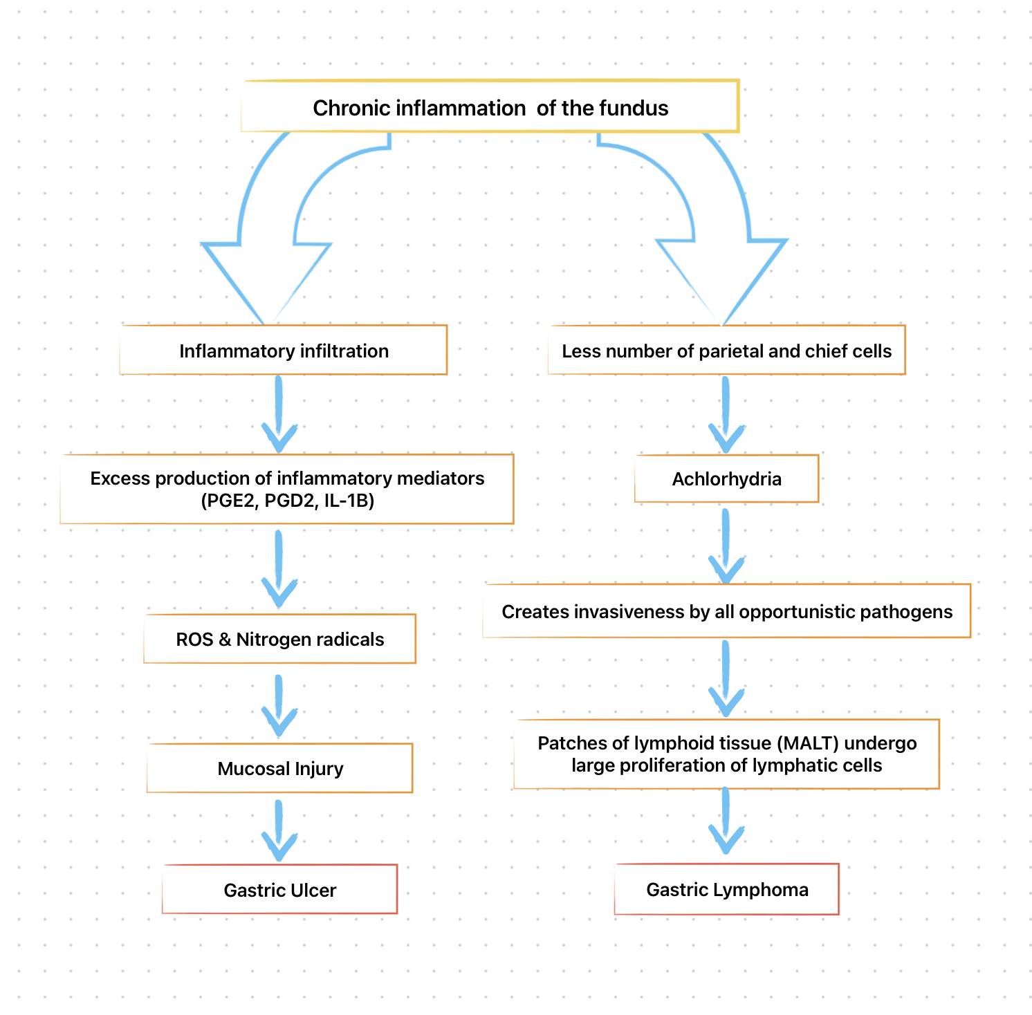 H. pylori infection leads to an inflammatory response that includes recruitment of neutrophils, lymphocytes (T and B), macrophages and plasma cells.