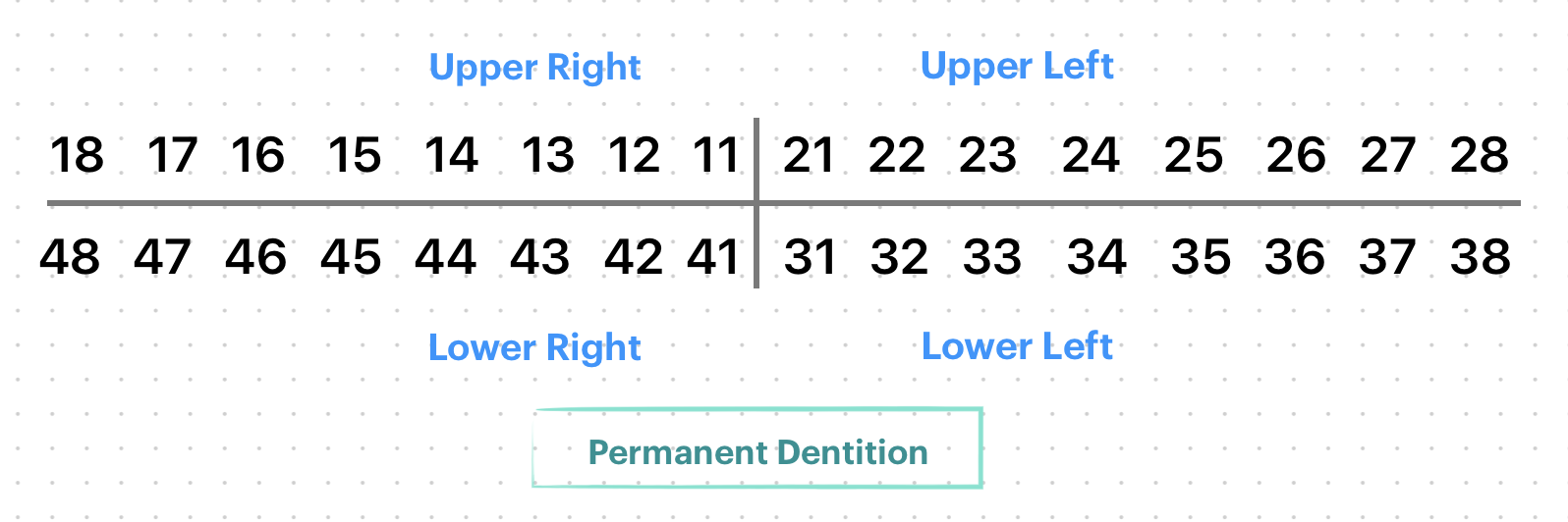 - Permanent dentition: 1, 2, 3, 4 are used to denote the sides (quadrants) i.e, upper right, upper left, lower left and lower right respectively. The tooth are numbered 1 through 8 in each quadrant, starting with the central incisor in each arch.