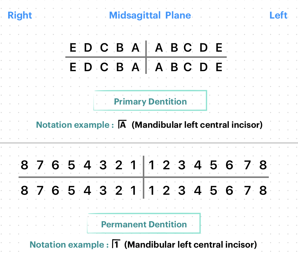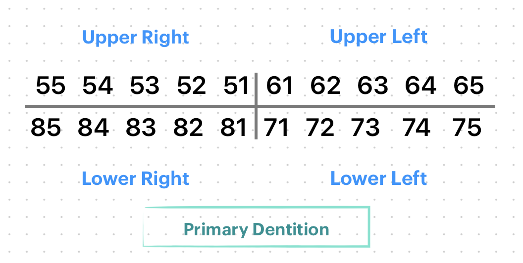 - Primary dentition: 5, 6, 7, 8 are used to denote the sides (quadrants) i.e, upper right, upper left, lower left and lower right respectively. The tooth are numbered 1 through 5 in each quadrant, starting with the central incisor.