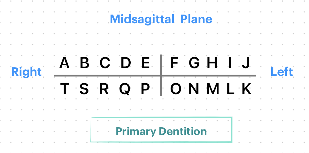 - Primary dentition: A through J for the maxillary teeth, beginning with the right upper second molar and K through T for the mandibular teeth, beginning with the left lower second molar.