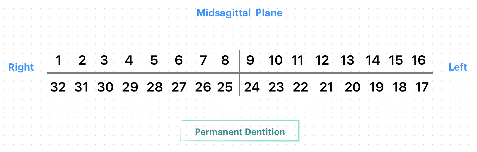 - Permanent dentition: 1 through 16 for the maxillary teeth, beginning with the right upper third molar and 17 through 32 for the mandibular teeth, beginning with the left lower third molar.